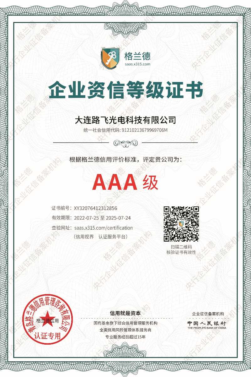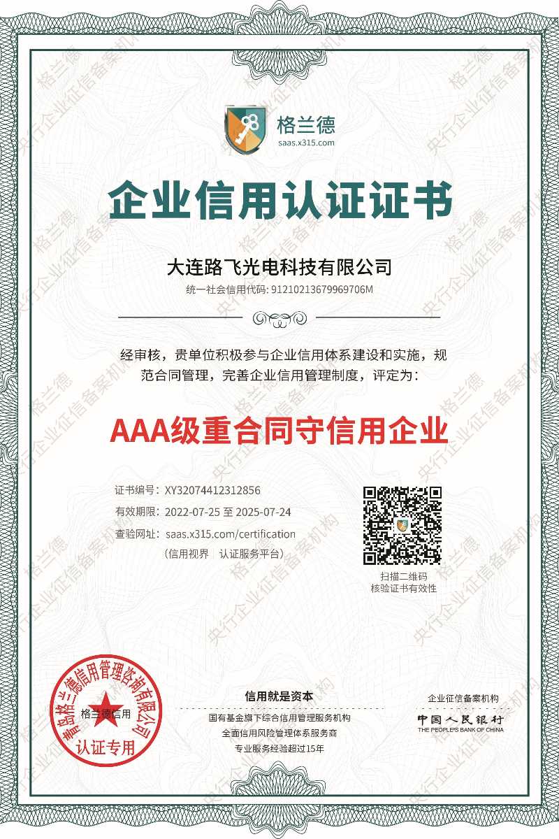 • 大連路飛光電科技有限公司3A級信用企業(yè)