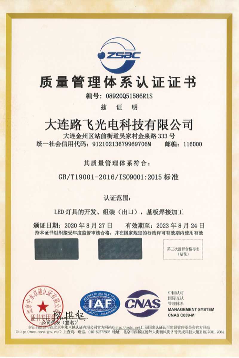 • 大連路飛光電科技有限公司質(zhì)量管理體系認證證書